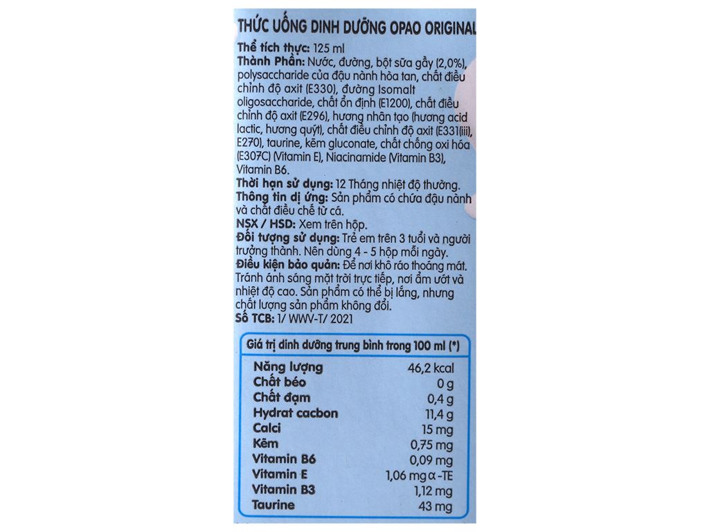 Thùng 36 hộp thức uống dinh dưỡng Opao vị original 125ml