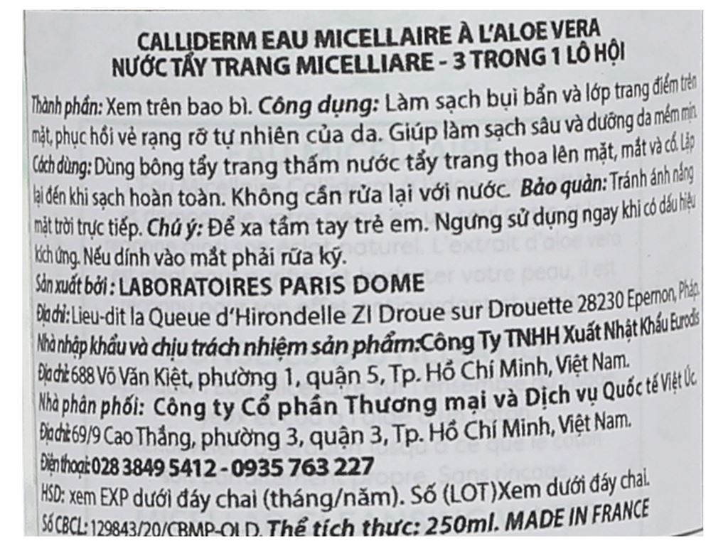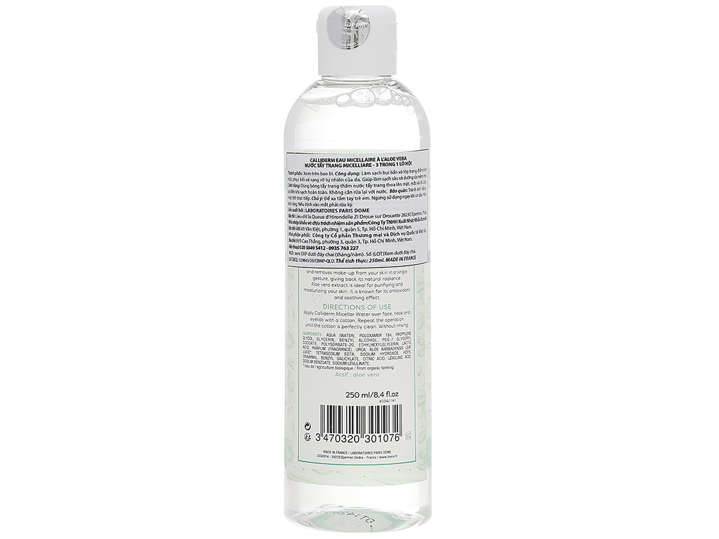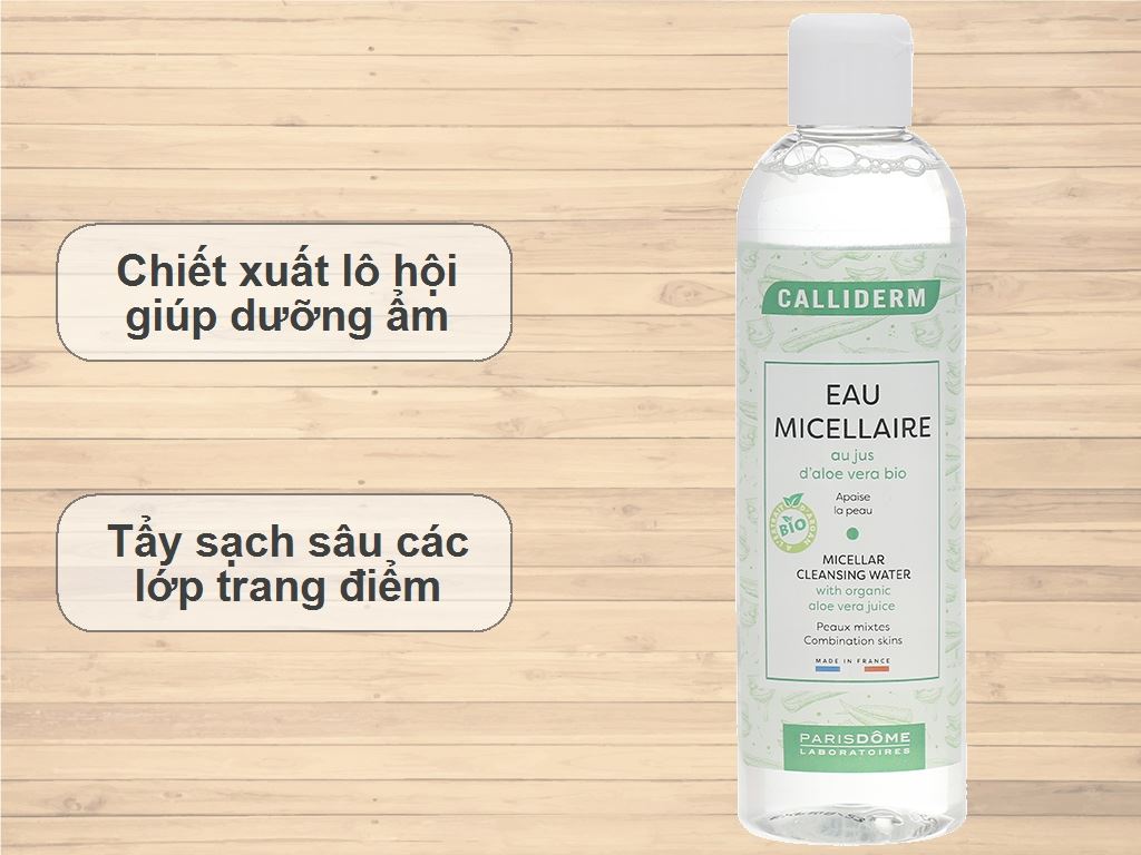 Nước tẩy trang 3 in 1 Calliderm Micellar chiết xuất lô hội chai 250ml