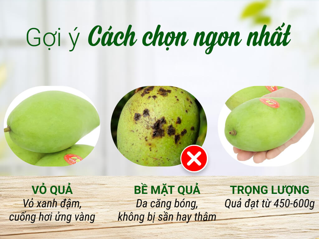 Nên chọn những quả xoài keo có màu sáng, xanh đậm, phần cuống hơi ửng vàng, cuống xoài còn tươi, trái xoài chắc, thơm.